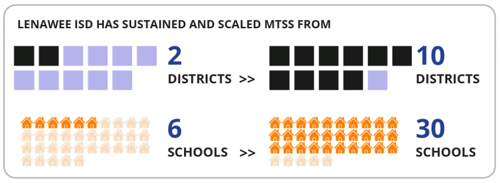 Lenawee ISD is a small regional education service agency that supports eleven rural local school districts, ranging in size from 340 students to 2,700 students. Prior to partnering with the Michigan Department of Education and the SISEP Center on a Multi Tiered System of Support (MTSS) project, Lenawee ISD had a good relationship with its local districts, providing special education itinerant services, hosting a countywide Career and Technical Education (CTE) program, and general education consulting services (literacy, math, and science).